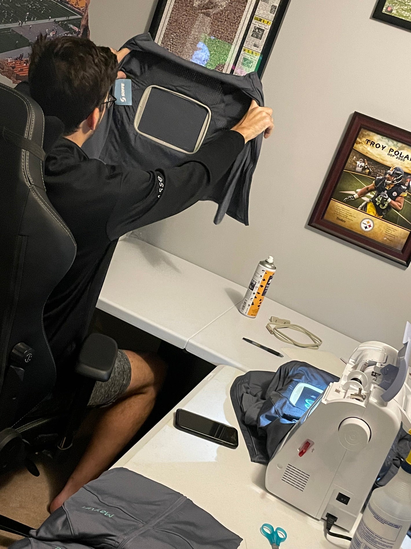 Hi! My names Anthony DeStefano, here's a picture of me in the shop. I was in the middle of one of our first orders of Personalized First Name on front and Logo on the back jackets!